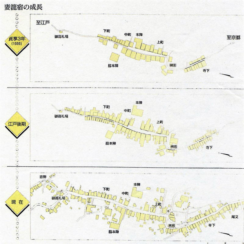 妻籠には、江戸時代の初期には、上町と寺下との境界に宿場南端の桝形がありました。やがて、宿場街は南に拡大して寺下と尾又の街区が加わりました。今残されている桝形跡は、したがって、上町と寺下との境目にあります。