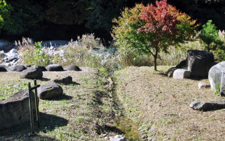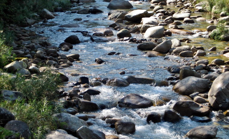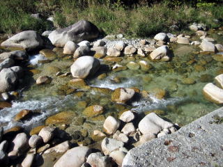 ![]() 蘭川の流れ: 丸みを帯びた大小さまざまな意思が堆積する河床。流水の威力を物語る。 |