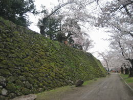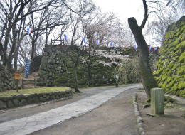 本丸の西端を南北に延びる石塁の長さは、100メートルほどにもなります。その外側(西側)は馬場跡で、今は桜の名所になっています。