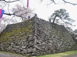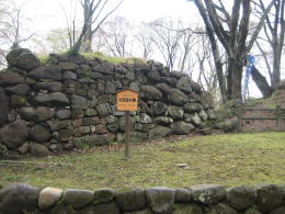 帯曲輪の北西端にはひときわ高い石垣の天守台があります。ここには江戸初期の寛永期(1620年代頃)まで三層の天守が聳えていたと伝えられています。早い時期に天守は失われたようです。