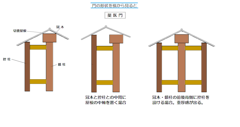 2つの図は真横から見た形状です。この図で薬医門の左右のいずれ側が外を向くかは、つねに決まっているわけではないようですが、通常は右がわが外を向き正面側となるようです。冠木と鏡柱を外に見せるわけです。