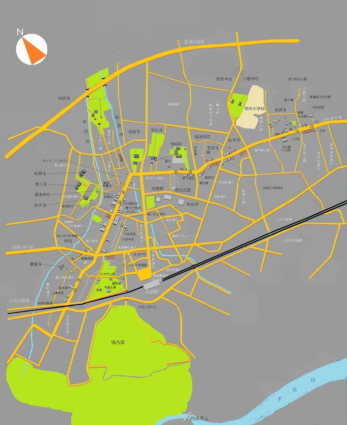 これは、小諸の旧北国街道沿いの街歩き全体をガイドするための絵地図です。街歩きの参考にしてください。 ほかに、この絵地図から本町、荒町、与良地区を抜粋した絵地図があります。 ⇒本町街歩き絵地図 ⇒荒町街歩き絵地図 ⇒与良街歩き絵地図