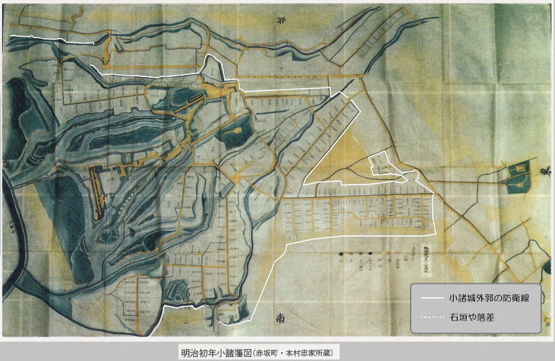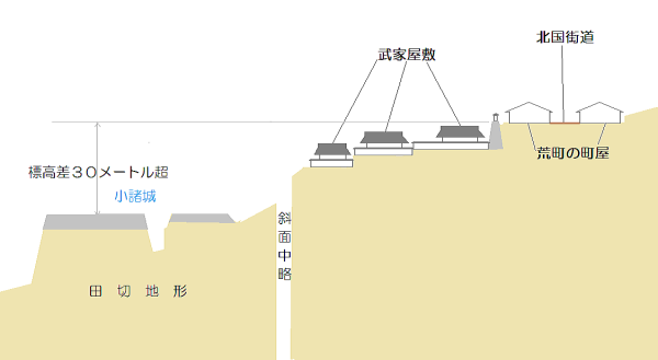 小諸城の本体は、田切地形を利用して断崖や谷によって幾重にも取り巻かれた二等辺三角形をなしていて、その外郭の北・東・南を武家屋敷の街並みが取り囲み、さらにその外側に北国街道沿いの町屋の家並みが取り巻くという構造になっています。