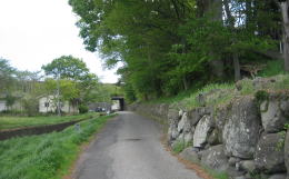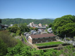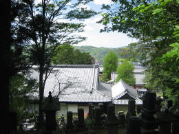 ▲成就寺の堂宇群 両側を谷川に挟まれ、裏手に小高い山が迫る地形、そして本堂の前を石垣と池で囲む形は、あたかも防備の堅い城に見える。