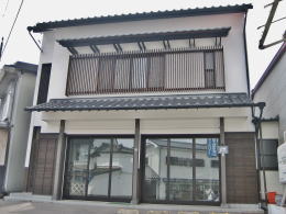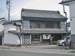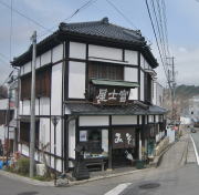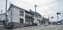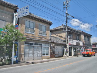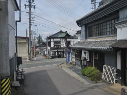 国道の右側には大正から昭和にかけての時代の建物がつくる景観で、中央「ひしや釣具店」の右の小路は江戸時代から続く旧北国街道です。