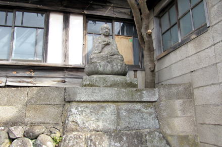 ![]() 今は無住らしい古民家の軒下(右端)に置かれた弘法大師座像。左の石塔は大乗妙典奉納塔。 |