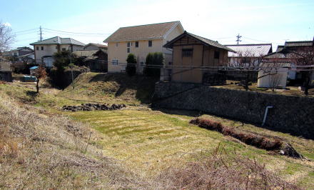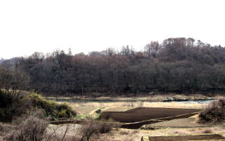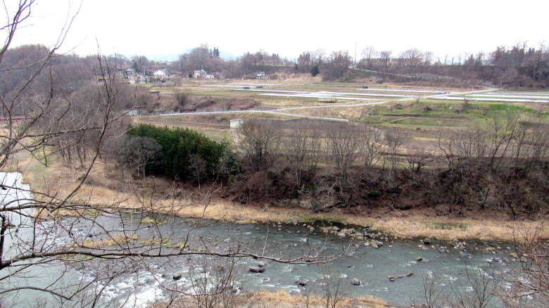 ![]() 千曲川東岸の大浦宮沢集落から対岸の耳取の河岸段丘地形を眺める。耳取城の縄張りの南西端の風景。 |