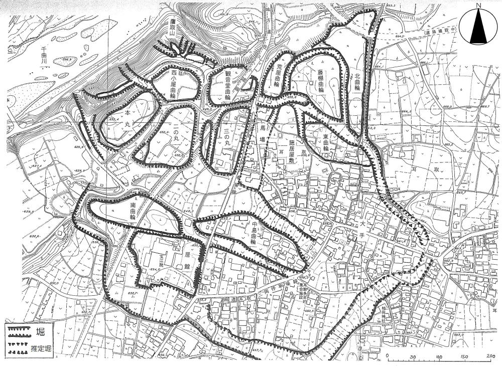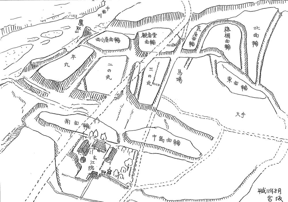 してみると、鳥観図のなかで北曲輪から西小屋曲輪に城館や集落を築いて、安全な谷間に耕作地を開き、壇上に家臣の集落を兼ねた砦を広げていったのではないかと考えられます。私見では、時期は鎌倉末期から室町前期にかけてではないでしょうか。
