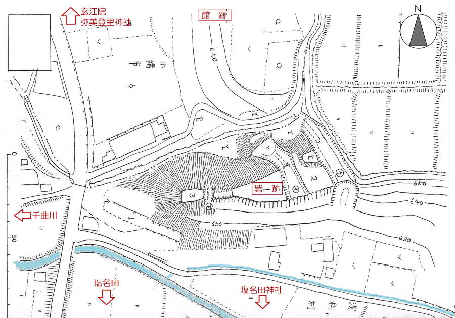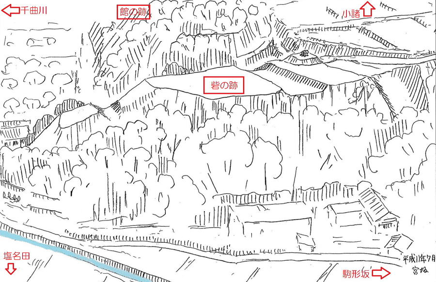 ところで宮坂氏は、城砦の北側の丘の麓を館跡と見ていますが、私の見方では、そこは家臣団の集落(初期の城下街)の一角で、背後の丘の上に領主館があったのではないでしょうか。領主館の周りの防御施設が南側の丘尾根上に延びて砦となったものと見ています。