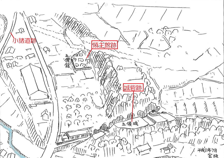 してみると五領の館と砦は、千曲川西岸の八幡・望月方面や南の塩名田・御馬寄ないし落合方面を監視し、小河川の渓谷以北を大井氏の所領であることを明示する境界とするためにつくられたのではないかと見られます。