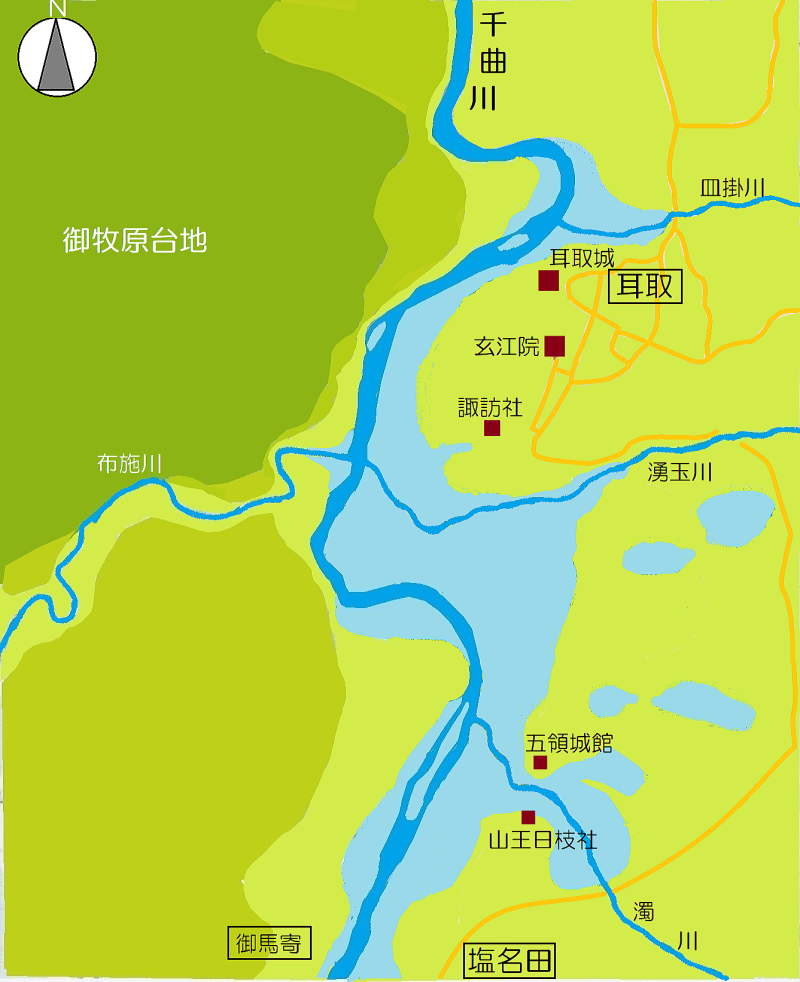 上掲の絵地図は、13〜17世紀はじめ頃までの小諸市耳取近辺の千曲川水系の古地理を推定して描いたものです。一帯の地形・標高などを調べ、探索して想像復元したものです。