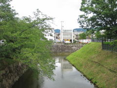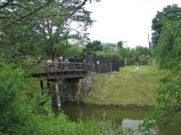 公園の北端の堀畔は今では道路になっている。堀に沿って東に歩くと、木製の橋が見えてくる。それを渡ると二の丸公園に入る。
