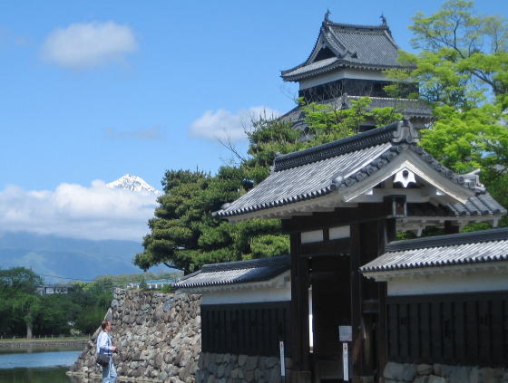 【写真上】太鼓楼の踊り場から北東を眺めてみた。松本盆地を縁取りする山並みの高さは標高1000mくらいだ。その尾根筋の上に顔を出しているのは、戸谷峰(標高1629m)。