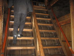 松本城は無駄な空間がまったくない構造なので、各階層は急角度で上に伸びています。つまり、底面積のコンパクトさの割に天井が高いということになります。