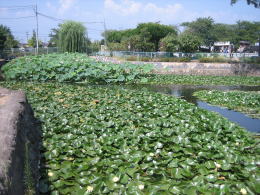 Huge colony of lotuses on moat, summer