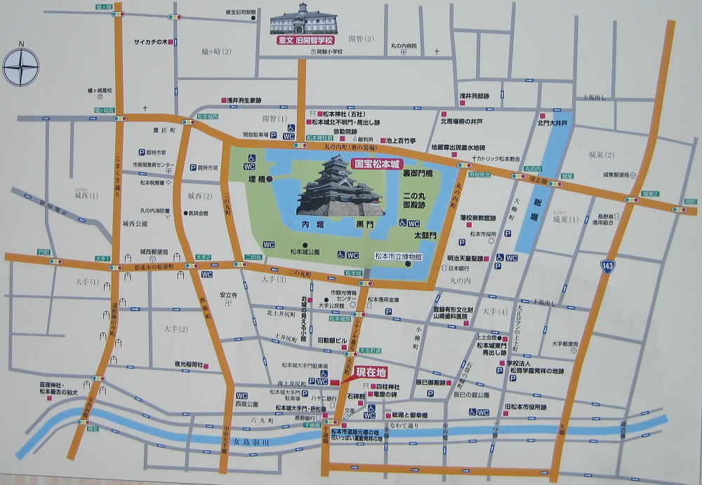 松本市街の中心部の街あるきのために大いに役立ちます。松本城の歴史、とくに城の縄張り(全体の設計構想)に関心がある人は、これを「松本城縄張り絵地図」と比較検討してみてください。この絵地図が表示しているのは、だいたい昔の総堀(大外堀)で囲まれた区域です。