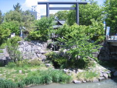 ▲対岸から神社を望む 右手の橋は幸橋