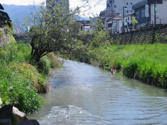 縄手通りから女鳥羽川の河床に下りる階段はあちこちにあって、河床は親水公園でもある。河岸道路の散策もまた楽しい。