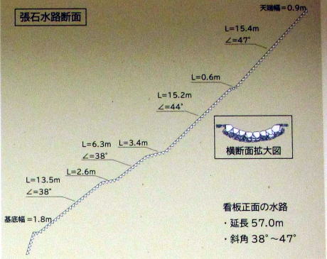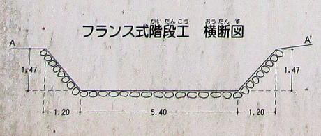 まずフランス式階段流路の最上部の工法を、現地にある説明板を引用して説明します。下に掲載した写真はその説明板からの引用。