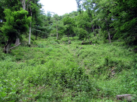 山腹の斜面全体が草と樹林に覆われています。かつてはハリエンジュとアカマツが中心の植生でしたが、現在では、土壌と生態系の安定により適したカエデ類やミズナラ、コナラなどの落葉広葉樹に植え替えて、森林の相を組み換える事業が進められています。