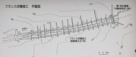 この施工法のもとになったフランスのサニエル渓谷の階段工法(一番上の図)はかなり厳重な造りに見えます。施工場所の地形や地質による違いもあるのかもしれませんが、牛伏川の施工技術の方が簡略に見えます。