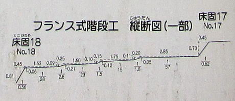 右の平図面にあるように、第1石堰堤では、長さ141メートルの流路に19段の階段が設けられています。