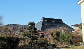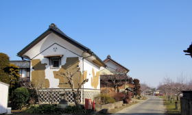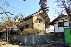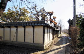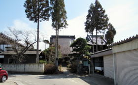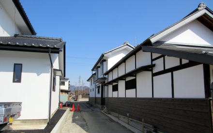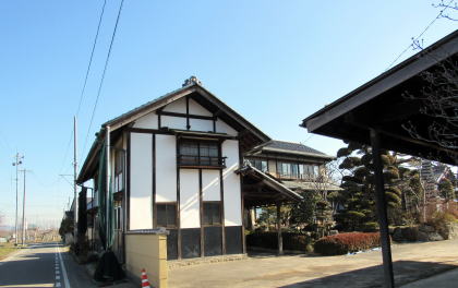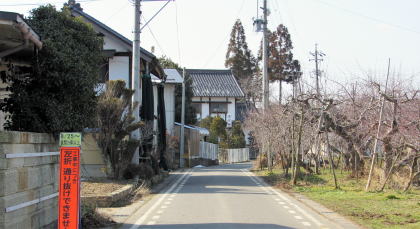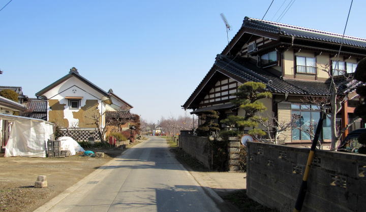 赤沼集落南端の二股で右に進路を取ると、すぐに家並みが見えてきます。広壮で重厚な和風家屋や土蔵が並んでいます。土蔵は壁の白漆喰が剥落してます。これは水害の影響でしょうか。