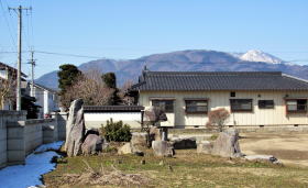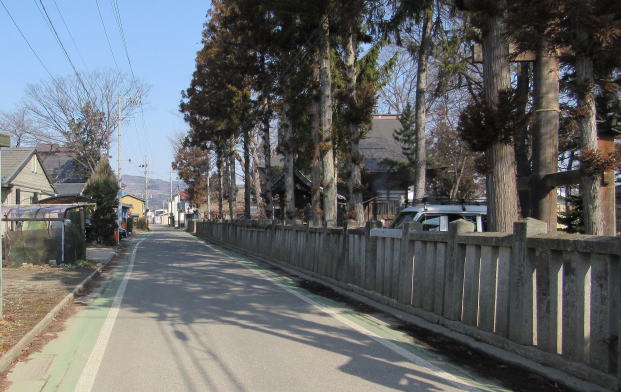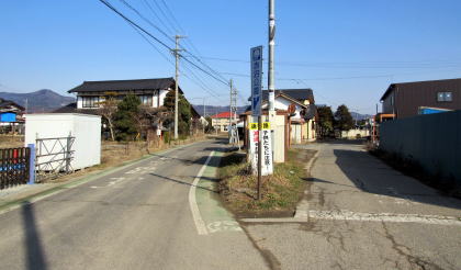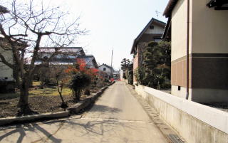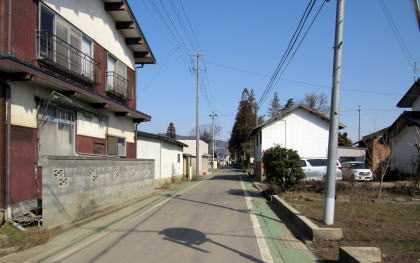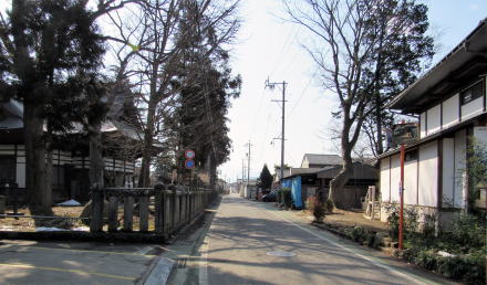 北に歩くと大田神社の先で三叉路に出ますが、県道368号から分岐していく右側の小路が本来の街道(松代道)です。この通りの方が家屋がやや立て込んでいる感じがします。道幅の狭さが、旧街道の面影を呼び起こしてくれるようです。