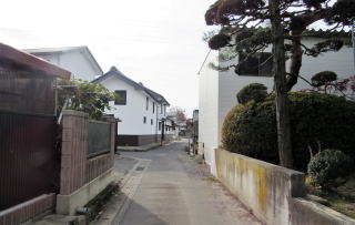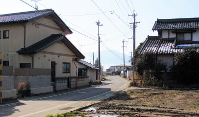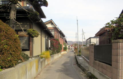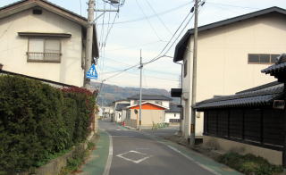 大田神社裏手から街道(南方)を振り返る(左手が神社、右端が社務所神官宅)