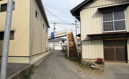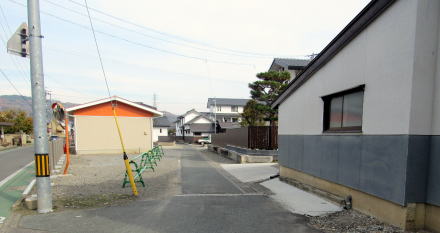 三叉路の分岐の間には、古い建物があったようですが、水害で壊れて撤去されてしまいました。今は砂礫を敷き詰めた空き地になっています。