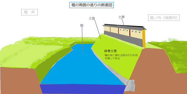 長沼藩と城が存在した頃には、堀の周りには土塀がめぐらせてあって、その上には連続する土塀がつくられていました。城郭内の道は家臣の途上や藩の公用のための通行に用いられました。商工業者や農民などの一般庶民は、日常の仕事のためには、外堀内の道路を通行していたはずです。彼らは外堀土塁の上にめぐらされた土塀に遮られて城内を見ることができませんでした。