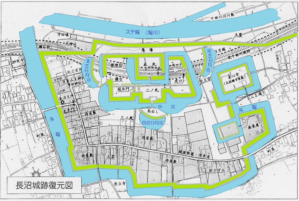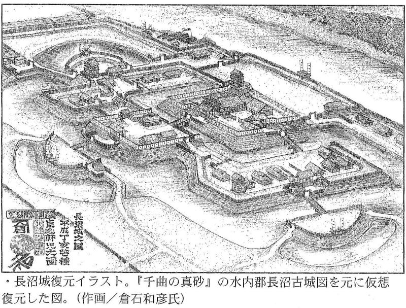 上掲の長沼城復元図は、長沼歴史研究会刊『長沼城の研究――城跡の検証』(H26刊)からの出典です。土塁と水堀については私が着色を施しました。