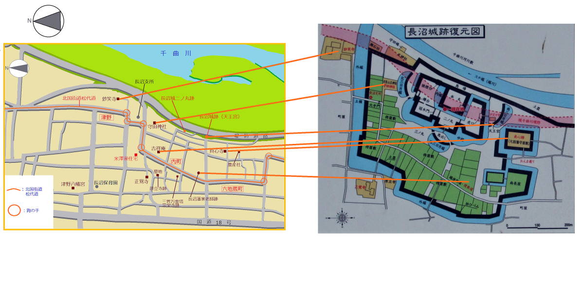 下掲の絵地図は、六地蔵町と内町・津野の現在の地理と長沼城復元図とを対比したものです。