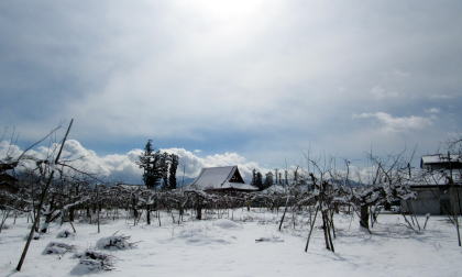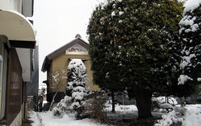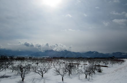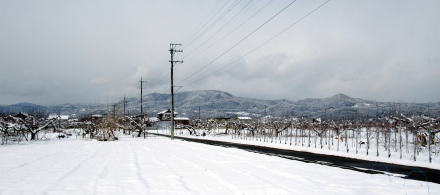 それにしても、長沼は雪景色が似合うところです。果樹園越しに寺院や家並み景観をここに掲載しておきます。