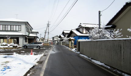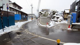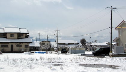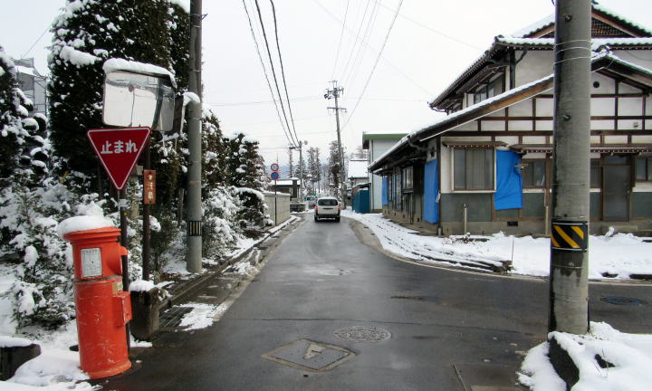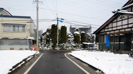 積もった雪が建物や道路の陰影を際立たせています。30年ほど前には、この辺りでも50センチメートル以上の積雪が不通にあったので、この写真の程度の積雪ではまだ少ない方です。