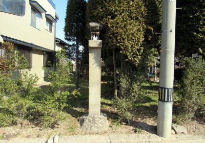 30メートルも歩くか歩かないうちに、鉤の手辻にいたりました。古びた赤い郵便ポストの脇、T字路に高さ2メートルあまりの石柱道標が立ってます。てっぺんには石の祠が載せてあります。