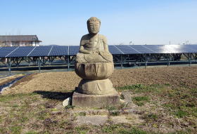 ▲忠恩寺跡の草原に立つ阿弥陀如来座像