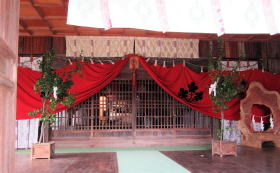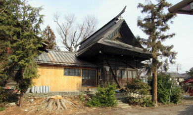 それから12年後、北信濃は武田家の支配下に治まり戦乱のおそれがなくなったため、諏訪大明神は長沼に戻されました。その地が現在地のようです。おりしもそのとき、武田信玄は長沼城(と城下集落)を建設していたので、この神社の社殿造営にあたったそうです。あるいは、神社の長沼への帰還は、信玄の招きに応えたのかもしれません。