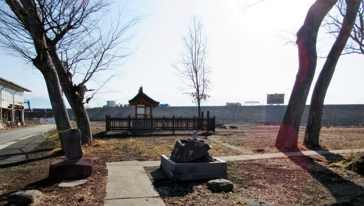 修復された堤防の下から境内と社殿を眺める