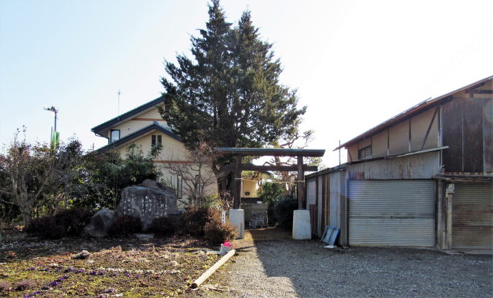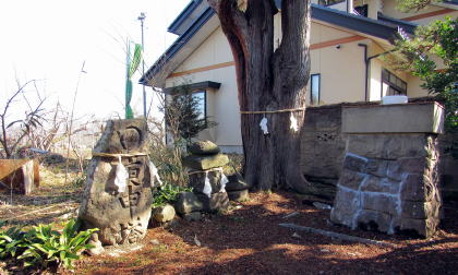 長沼には、民家の敷地内の一隅に稲荷社などの小さな石祠が祀られた「屋敷神」があります。屋敷神は、同じ姓を名乗る家門が祀る氏神の系列下に置かれているようです。ここは、この辺りの農家の氏神社があった場所かもしれません。