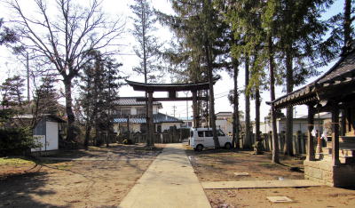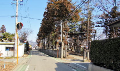 旧街道脇の境内と参道入り口の大鳥居