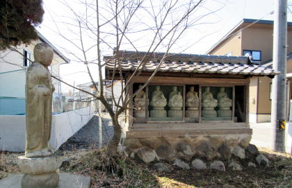 まず蓋舎のなかに並んだ六つの石仏ですが、それぞれに別の仕草をしています。合掌する像、子どもを膝上に抱く、数珠らしい綱を回し手繰る像など、6つの石仏がどれも異なる姿勢なのです。菩薩像ではあっても、地蔵なのでしょうか、観音なのでしょうか。