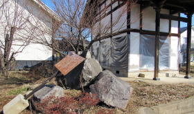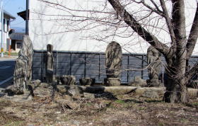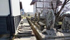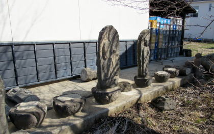 境内の街道脇北端には、六観音像と庚申塔が並んでいます。観音像のうち4つは、洪水で台座から落とされ倒されたまま、今も横倒しになっています。そして、庚申塔は、台座の上に積み上げてあるとても希少な造りです。
