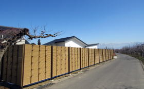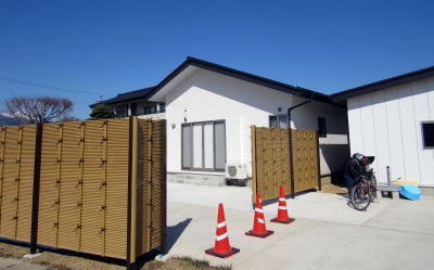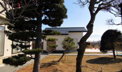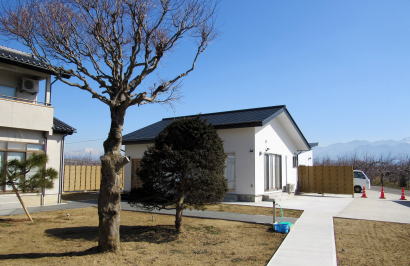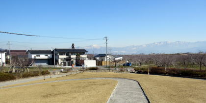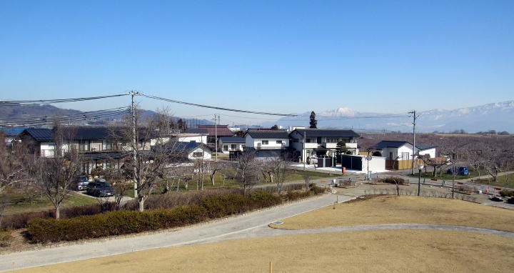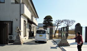 一般住宅風の造りの本堂: 背後に広大な各園地帯が広がる