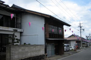 金丸土屋も酢屋茂の建物はともに、土台の構造が街道の傾きに対応したものになっています。歩いていてもさほど道路の斜度は感じませんが、笠取峠から下ってきた坂道がまだ続いているのです。