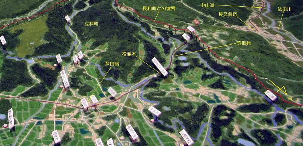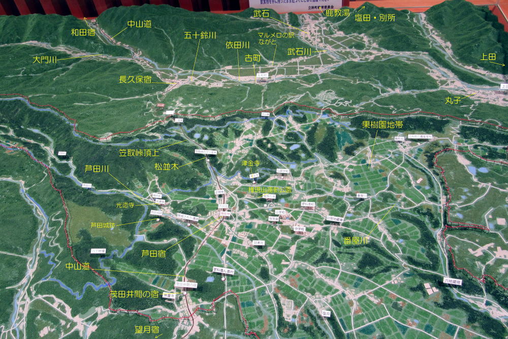 長窪から芦田宿近辺の地形を立体的に表示するディオラマです。地理や地形に興味がある人は、これを参照してください。もっと詳しく知りたい人は、芦田宿のふるさと交流館を訪ねてじっくりみてください。