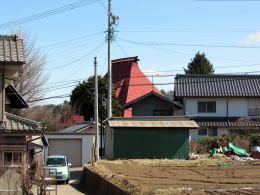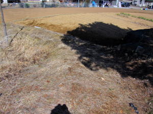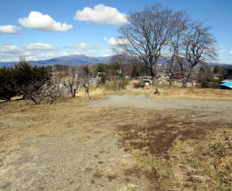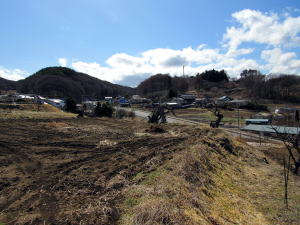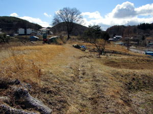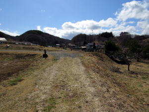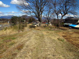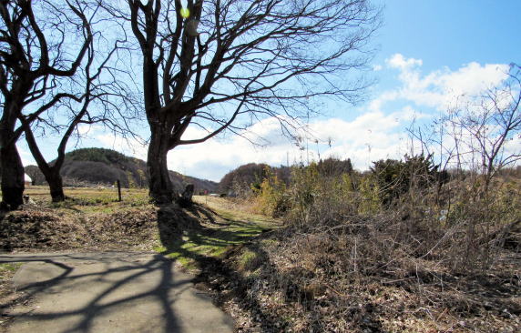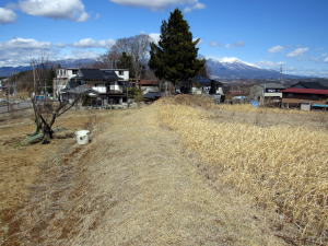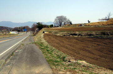 大ケヤキから南西に向かって50メートルほどは、農道として街道跡は残されていますが、そこから先は畑のなかに消え去っています。さらにその先には、丘陵斜面を切通して国道142号が通っていて、地形はすっかり改造されています。