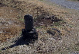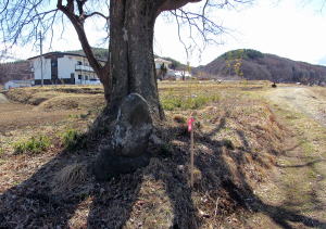 国道のすぐ上の畑から大ケヤキまでは草原のなかの農道が続いています。その農道の脇に、すっかり風化して馬頭観音か道祖神か判別できない古い石仏があります。江戸時代に中山道の芦田宿を行き来する旅人も、この石仏を道脇に見ながら通り過ぎたのでしょうか。