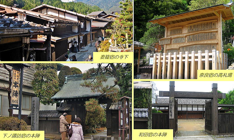 宿駅集落には、本陣・問屋・脇本陣、さらにこれらを補佐する年寄という役職が設けられ、名主などの在地有力家門が幕府によって任命されました。そういう有力者の多くは、たとえば馬籠や妻籠のように、伊那・中津川などほかの地方から移住して五街道制度の建設にともなう集落建設や農耕地開拓を指導した郷士層もいました。