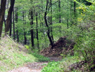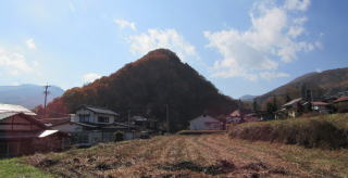 画像中央の山は城山(上ノ山)で、江戸時代の中山道はこの尾根の東(左)側を通っていたが、東山道は西(右)側の谷間を通っていたという。